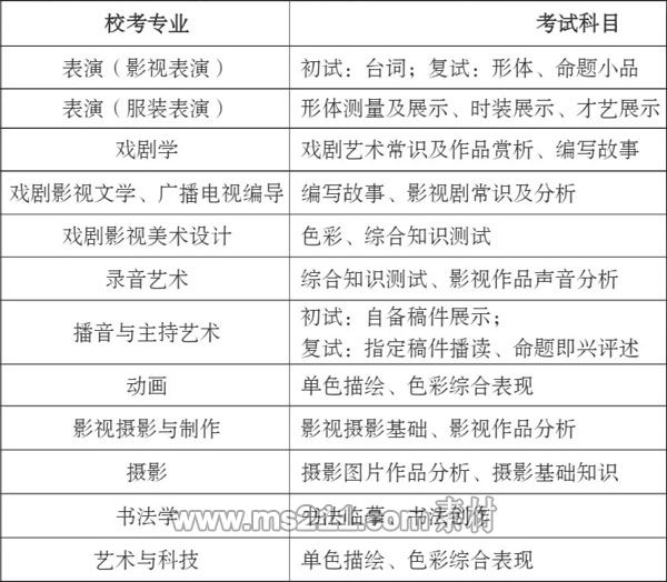 2.專業(yè):表演(影視表演、服裝表演)、戲劇學(xué)、戲劇影視文學(xué)、廣播電視編導(dǎo)、錄音藝術(shù)、播音與主持藝術(shù)、影視攝影與制作、攝影