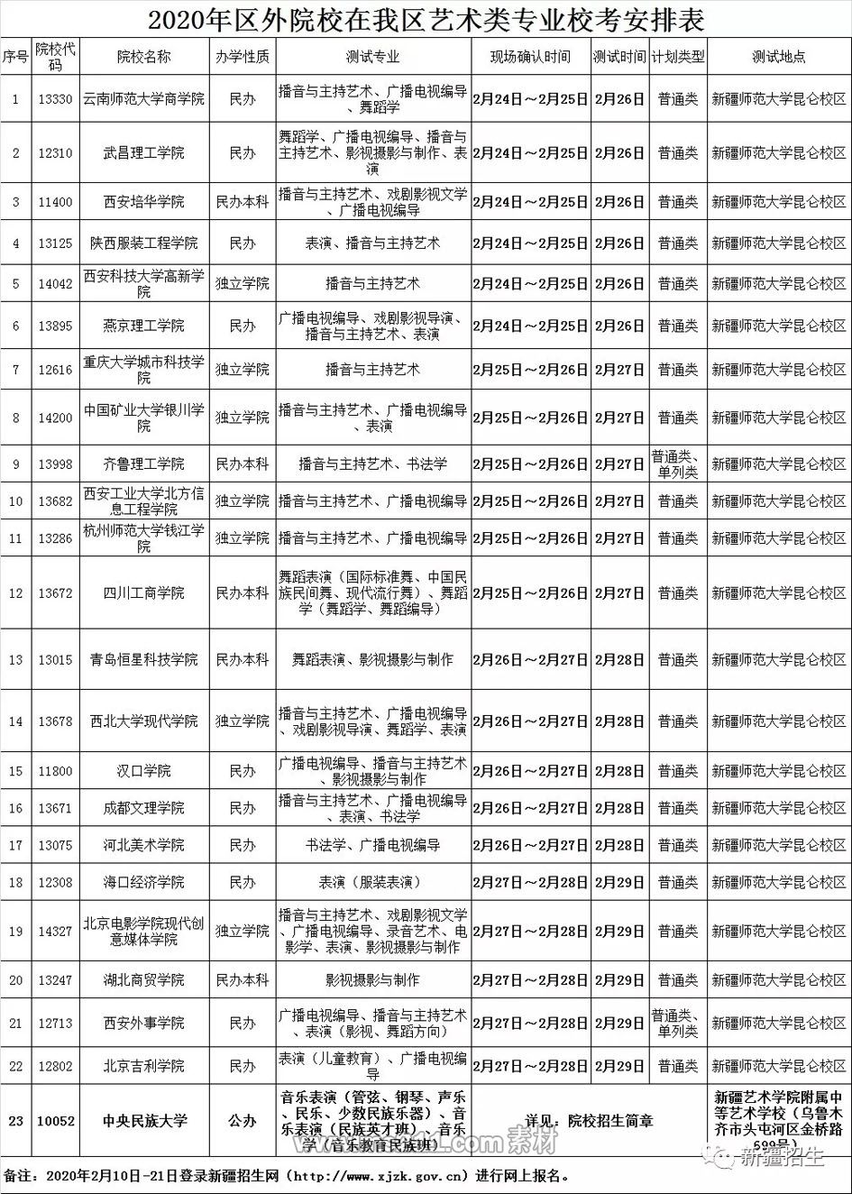 除中央民族大學(xué)在新疆藝術(shù)學(xué)院附屬中等藝術(shù)學(xué)校組織校考外,2020年區(qū)外院校在我區(qū)組織??伎键c(diǎn)統(tǒng)一安排在新疆師范大學(xué),考試時(shí)間:2020年2月26日—3月1日。各院校??季唧w報(bào)名、考試時(shí)間見(jiàn)下表,藝術(shù)類考生可自行聯(lián)系參加考試。