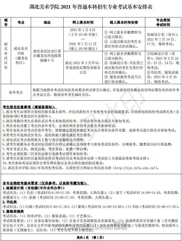 (一)報考湖北美術(shù)學(xué)院繪畫設(shè)計類、動畫(中外合作辦學(xué))的考生,必須參加考生所在高考省份(自治區(qū)、直轄市)美術(shù)學(xué)和設(shè)計學(xué)的藝術(shù)統(tǒng)考,統(tǒng)考成績達到我校在各省劃定的成績要求,方可報名并必須參加我校組織的繪畫設(shè)計類??肌?br /> ?。ǘ﹫罂嘉倚?、服裝表演類的考生,所在高考省份(自治區(qū)、直轄市)有組織相應(yīng)類別省統(tǒng)考的,考生相應(yīng)類別省統(tǒng)考成績合格,方可報名并必須參加我校組織的相應(yīng)類別校考;所在省(自治區(qū)、直轄市)未組織相應(yīng)類別省統(tǒng)考的,考生按所在省區(qū)市要求報名,并必須參加我校組織的相應(yīng)類別??肌?br /> ?。ㄈ┛忌谶M行全國高考院校及專業(yè)志愿填報時,所填報的我校專業(yè)志愿有??紝I(yè)合格要求的,必須與考生本人取得的??己细褡C專業(yè)類型一致,即繪畫設(shè)計類(含動畫<中外合作辦學(xué)>)、書法類、服裝表演類三類合格證。