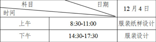 考試所需繪畫工具、剪裁工具等自備。服裝工藝考試具體時(shí)間、地點(diǎn)詳細(xì)安排由考點(diǎn)另行公布,服裝設(shè)計(jì)、服裝紙樣設(shè)計(jì)考試時(shí)間統(tǒng)一安排如下: