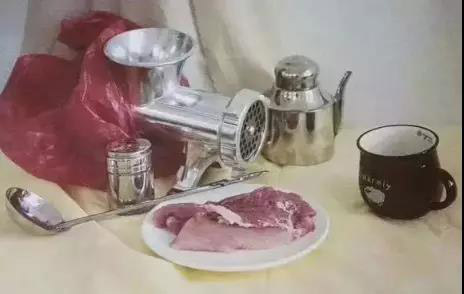 色彩考題:一個(gè)半裹著紅色塑料袋絞肉機(jī),一個(gè)油罐、一個(gè)茶缸、一個(gè)調(diào)味瓶,一個(gè)勺子、一盤裝著肉的圓盤,一條黃色襯布、一條淺灰色襯布。