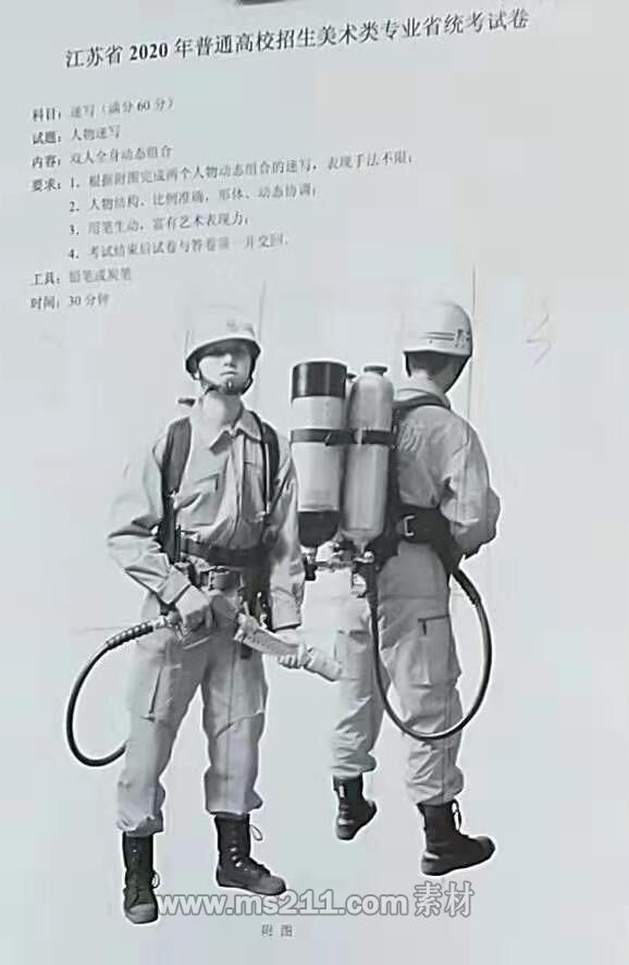 速寫考題:兩個消防員,一個正面、一個背面,帶著消防器材。
