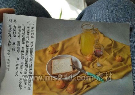 色彩考題點(diǎn)評:貴州色彩考題相對往年更簡單了,但整個(gè)畫面給出了一個(gè)固定色調(diào):黃色調(diào),橙汁、小橘子、襯布全都是黃色,所以對考生來講,在對于同類色區(qū)分上有一定的考驗(yàn),但從物體上的數(shù)量來講,數(shù)量少,比較容易刻畫,考生可先確定大色調(diào),然后再逐步細(xì)畫,最后水果刀把的綠色畫好,起一個(gè)點(diǎn)綴作用,會特別出彩。