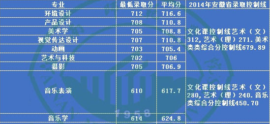 省外考生須參加我校單獨(dú)組織的藝術(shù)類(lèi)專(zhuān)業(yè)??疾⑷〉煤细褡C,在文化課和專(zhuān)業(yè)課達(dá)到規(guī)定要求后,按綜合分從高分到低分擇優(yōu)錄取。綜合分=(專(zhuān)業(yè)成績(jī)÷專(zhuān)業(yè)總分)×700+(文化成績(jī)÷文化滿(mǎn)分)×300;安徽省使用省統(tǒng)考成績(jī)錄取,按照該安徽省規(guī)定的綜合分進(jìn)行投檔與錄取。美術(shù)類(lèi)專(zhuān)業(yè)含動(dòng)畫(huà)、美術(shù)學(xué)、攝影、視覺(jué)傳達(dá)設(shè)計(jì)、環(huán)境設(shè)計(jì)、產(chǎn)品設(shè)計(jì)、藝術(shù)與科技,音樂(lè)類(lèi)專(zhuān)業(yè)含音樂(lè)學(xué)、音樂(lè)表演。