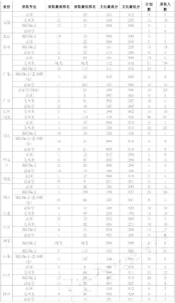 藝術(shù)類(音樂類、美術(shù)類)專業(yè)招生錄取時,在考生思想政治品德考核與身體健康狀況檢查合格的基礎(chǔ)上,考生參加“普通高等學(xué)校招生全國統(tǒng)一考試”的成績達(dá)到生源所在?。ㄗ灾螀^(qū)、直轄市)相關(guān)層次最低控制分?jǐn)?shù)線的情況下,按照各?。ㄗ灾螀^(qū)、直轄市)招生部門要求,凡規(guī)定考生須取得所在省組織的藝術(shù)專業(yè)統(tǒng)考合格(證)才能報考的,考生必須持有所在省(自治區(qū)、直轄市)藝術(shù)專業(yè)統(tǒng)考合格證方可填報志愿。我校音樂學(xué)、舞蹈編導(dǎo)、表演和美術(shù)類(非廣東省生源)等校考專業(yè)按照綜合成績擇優(yōu)錄取。綜合成績=(術(shù)科成績÷術(shù)科總分)×70+(文化課成績÷文化課總分)×30,其中,美術(shù)類專業(yè)術(shù)科總分為200分,非美術(shù)類專業(yè)術(shù)科總分為100分。內(nèi)蒙古自治區(qū)舞蹈編導(dǎo)專業(yè)(聯(lián)考)按照該自治區(qū)投檔原則擇優(yōu)錄取。廣東省美術(shù)類專業(yè)的考生按綜合成績(文化課成績×30%+術(shù)科統(tǒng)考成績×70%)從高到低擇優(yōu)錄取。