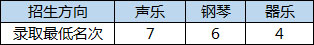 安徽、廣東:生源省份音樂專業(yè)文化控制線上20分,省專業(yè)統(tǒng)考成績達到本科錄取控制線,在達到文化和專業(yè)成績要求的投檔考生中,按照省招辦投檔規(guī)則和投檔成績由高到低錄取,不分文理,不設(shè)專業(yè)級差。