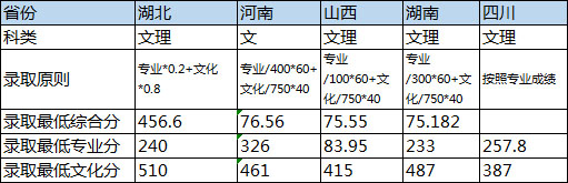 1.對于有統(tǒng)一投檔原則的省份,按照相關(guān)省份投檔原則投檔,在文化和專業(yè)都合格的投檔考生中,按照投檔成績由高到低錄取,高考文化成績無單科要求,湖北考生要求省統(tǒng)考專業(yè)成績達到240分;