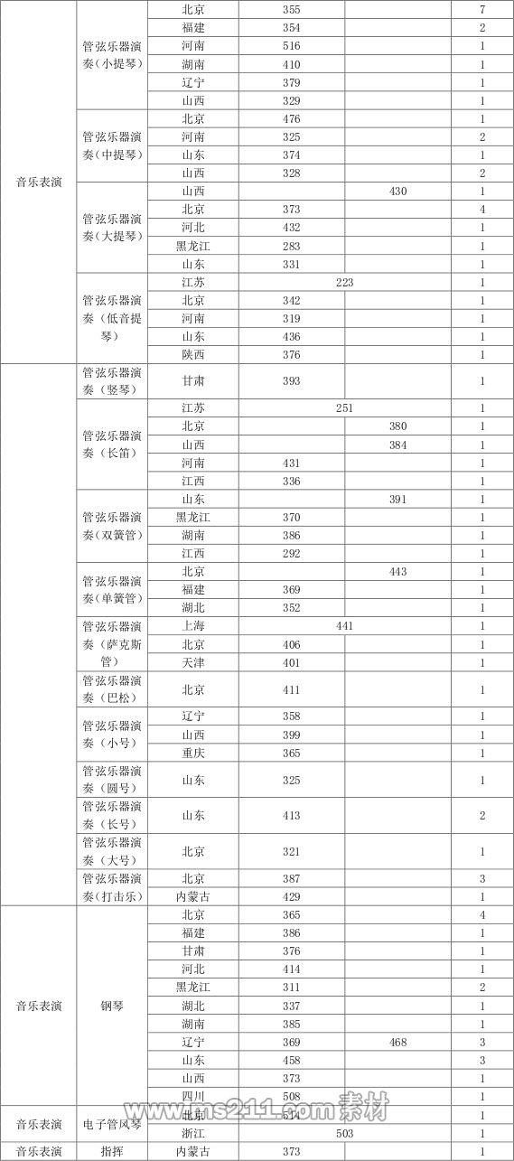 4、演唱(民族唱法)、演唱(美聲唱法)、中國樂器演奏、鋼琴、電子管風(fēng)琴、管弦樂器演奏等招考方向:錄取分?jǐn)?shù)線參照生源所在省(市、自治區(qū))藝術(shù)類同科類本科專業(yè)錄取控制分?jǐn)?shù)線劃定。