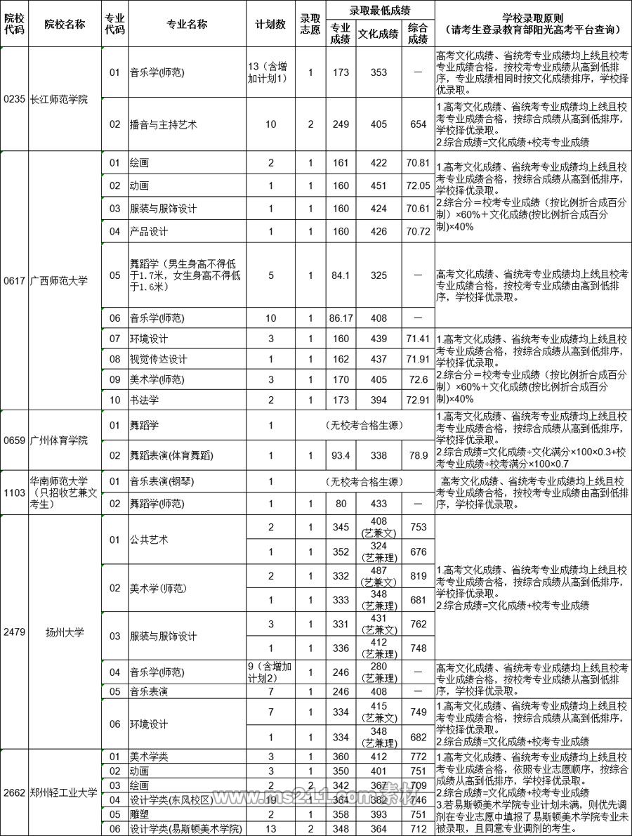 1.高考文化成績、省統(tǒng)考專業(yè)成績均上線且??紝I(yè)成績合格,按??紝I(yè)成績從高到低排序,學校擇優(yōu)錄取。 |