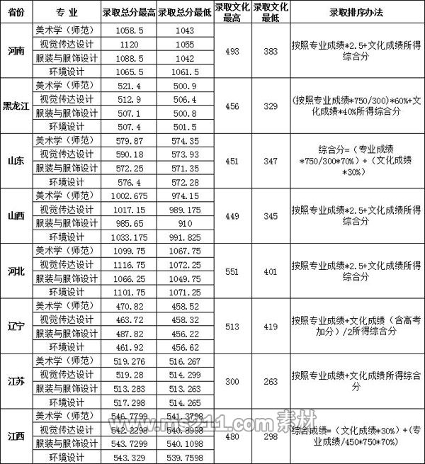 美術(shù)學、視覺傳達設計、服裝與服飾設計、環(huán)境設計:以綜合分投檔的省份,按照綜合分排序由高分到低分擇優(yōu)錄取;其他省份,按照專業(yè)成績乘以2.5加上文化成績所得的綜合分排序由高分到低分擇優(yōu)錄取。