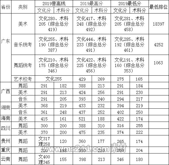 美術(shù)類、音樂類、舞蹈類專業(yè)以普通高考文化課總分和術(shù)科統(tǒng)考分?jǐn)?shù)合成的總分(文化課成績占40%、術(shù)科統(tǒng)考成績占60%)排序情況進(jìn)行投檔??偡趾铣捎嬎愎綖椋嚎忌偡?文化課成績×40%+術(shù)科統(tǒng)考成績×2.5×60%??忌偡峙判蛞?guī)則為:按合成總分從高到低排序,合成總分相同時,依照術(shù)科統(tǒng)考成績從高到低排序,術(shù)科統(tǒng)考成績?nèi)韵嗤瑫r,按照普通高考語文、英語、文科綜合/理科綜合、文科數(shù)學(xué)/理科數(shù)學(xué)科目成績依次排序。