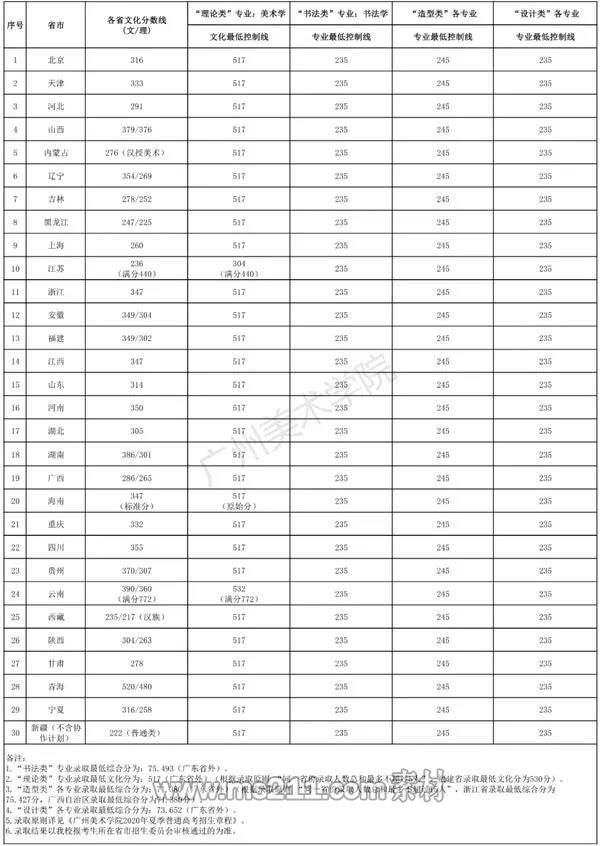 廣州美術(shù)學(xué)院2020年普通本科省外提前批藝術(shù)類錄取情況