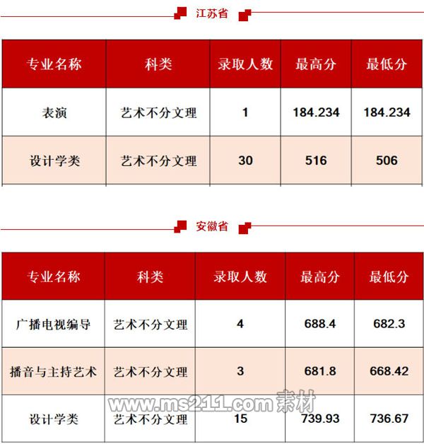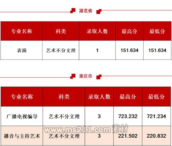 (3)播音與主持藝術(shù)和廣播電視編導(dǎo)專業(yè):[文化課成績(jī)(按比例折合成百分制)×40%]+[專業(yè)課統(tǒng)(聯(lián))考成績(jī)(按比例折合成百分制)×60%]=綜合總分,按綜合分從高分到低分錄取。