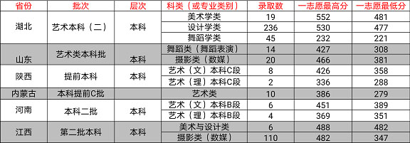 藝術(shù)類統(tǒng)考專業(yè)的錄取規(guī)則:美術(shù)類專業(yè)考生在取得當(dāng)?shù)厥〖?jí)專業(yè)統(tǒng)(聯(lián))考合格證后, 高考文化成績(jī)?cè)谠撌澏ㄙY格線以上者均可填報(bào)我校,原則上湖北省按(文化成績(jī)*40%+統(tǒng)考成績(jī)*60%)*2、外省按(文化成績(jī)*40%+統(tǒng)考成績(jī)*60%)作為考生的投檔成績(jī)從高分到低分擇優(yōu)錄取;舞蹈表演專業(yè)錄取規(guī)則:考生專業(yè)統(tǒng)(聯(lián))考合格,高考文化成績(jī)?cè)趧澏ǖ馁Y格線上,按專業(yè)統(tǒng)考成績(jī)從高分到低分排序錄取。若該省有特殊要求,遵循該省當(dāng)年公布的錄取規(guī)則。