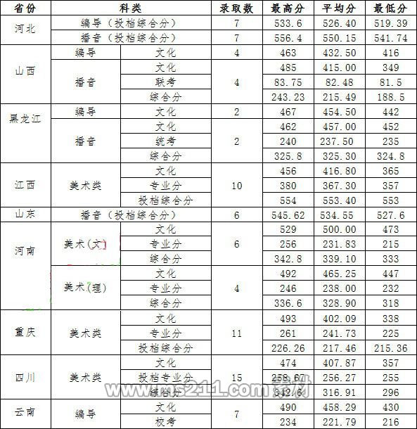 在無相應(yīng)專業(yè)統(tǒng)考(聯(lián)考)的省份,高考文化課成績達(dá)到學(xué)校在生源所在省前述兩專業(yè)錄取批次最低錄取控制分?jǐn)?shù)線,并取得本校專業(yè)校考合格證前提下,投檔至本校的考生,廣播電視編導(dǎo)專業(yè)按文化課總分(排位分)排名從高到低,擇優(yōu)錄取,文化課成績相同時(shí),專業(yè)??汲煽兏哒邇?yōu)先錄取。播音與主持藝術(shù)專業(yè)按綜合分從高到低擇優(yōu)錄取,播音與主持藝術(shù)專業(yè)綜合分=高考文化課成績(含政策加分)×40%+專業(yè)??汲煽?times;60%,綜合分相同時(shí),按照專業(yè)??肌⒄Z文、數(shù)學(xué)、外語成績順序,從高分到低分排序,排序靠前的考生優(yōu)先錄取。