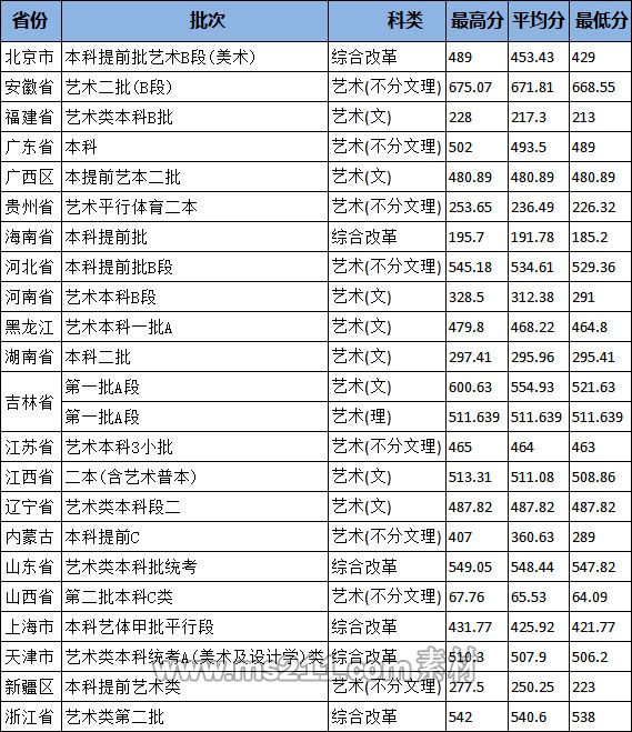 2.上表中“考試形式”為“校考”的,統(tǒng)計(jì)分?jǐn)?shù)為專業(yè)加試成績(jī);“考試形式”為“省統(tǒng)考”的,統(tǒng)計(jì)分?jǐn)?shù)是按照各省規(guī)定折算后的投檔成績(jī)。