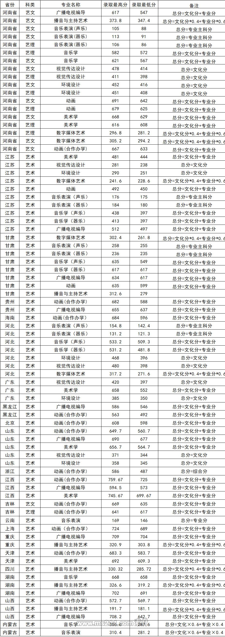 ①廣播電視編導(dǎo)專業(yè)、音樂學(xué)專業(yè)、美術(shù)學(xué)專業(yè)、動(dòng)畫專業(yè)、動(dòng)畫(合作辦學(xué))專業(yè):按文化分與專業(yè)分相加后的總分從高到低依次擇優(yōu)錄取(出現(xiàn)并列分時(shí),依次以專業(yè)分、文化總分、語數(shù)外分排序)。