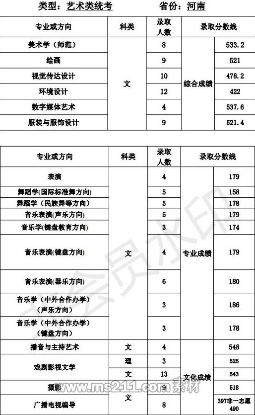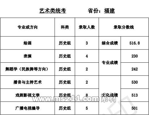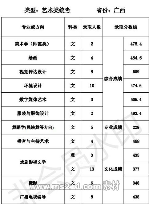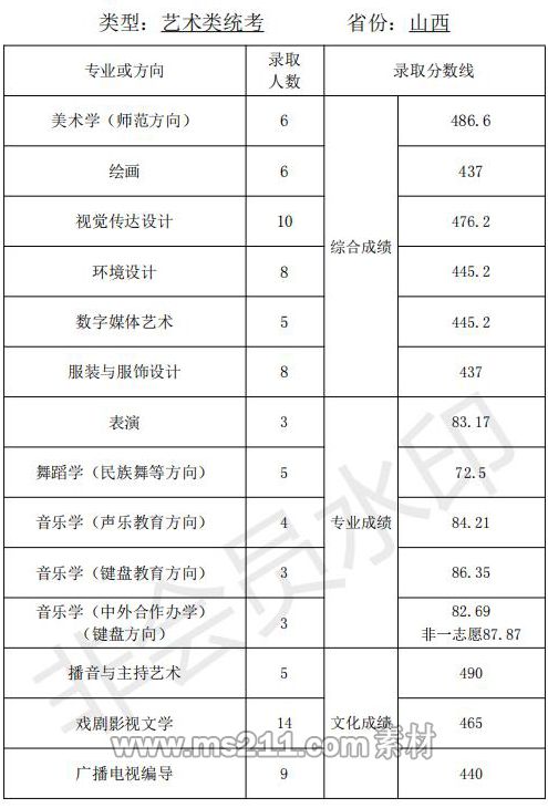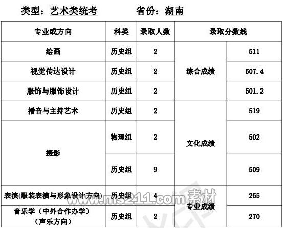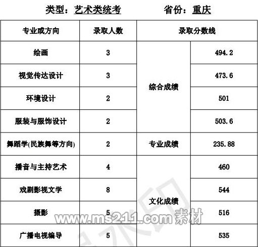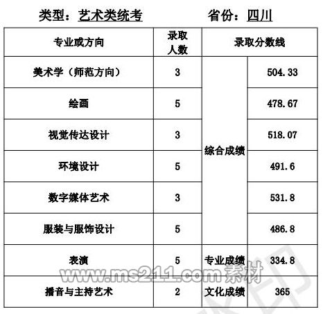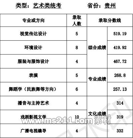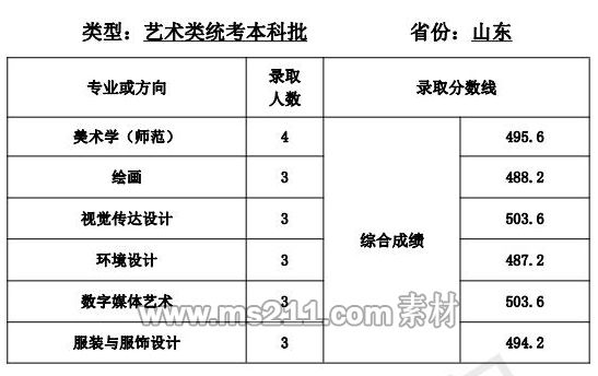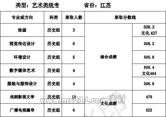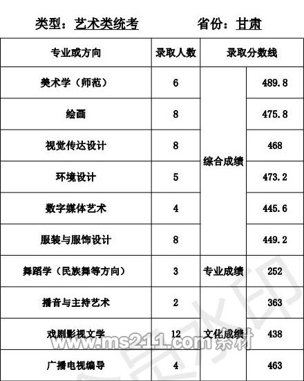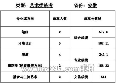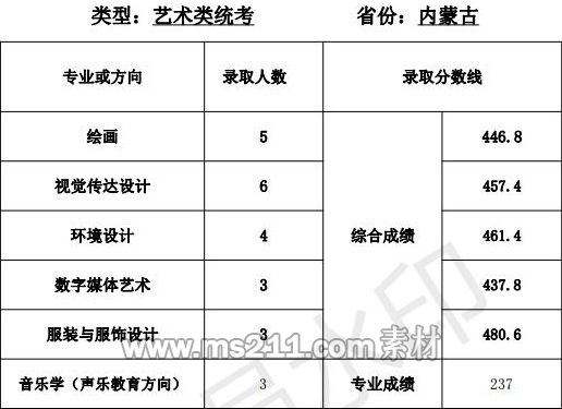 1.美術(shù)設(shè)計(jì)類專業(yè):專業(yè)省級統(tǒng)考成績和高考成績均須達(dá)到所在省 (區(qū)、市)劃定的藝術(shù)類本科專業(yè)錄取控制分?jǐn)?shù)線。根據(jù) 考生所在省(區(qū)、市)公布的招生計(jì)劃,按綜合成續(xù)擇優(yōu)錄取,綜合成績=文化成績*60%+專業(yè)省級統(tǒng)考成績*2.5*40%。
