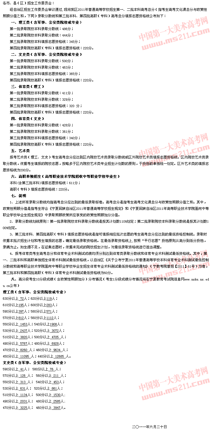 2011年寧夏區(qū)高考錄取分?jǐn)?shù)線(含美術(shù)類)