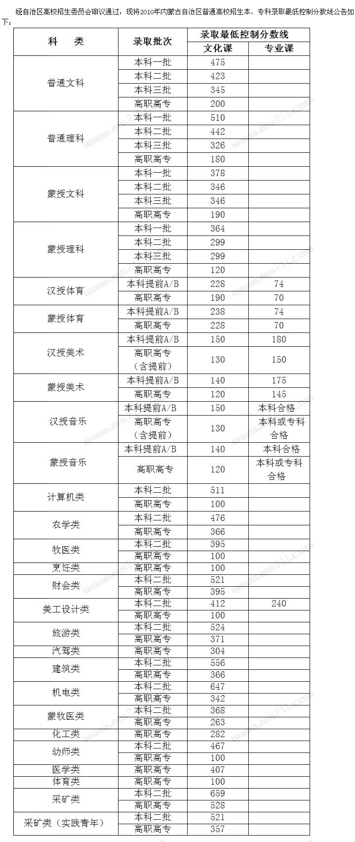 2010年內(nèi)蒙古高考錄取分數(shù)線(含美術(shù))