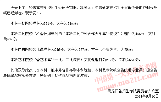 2011年黑龍江普通高等學(xué)校招生錄取控制分?jǐn)?shù)線