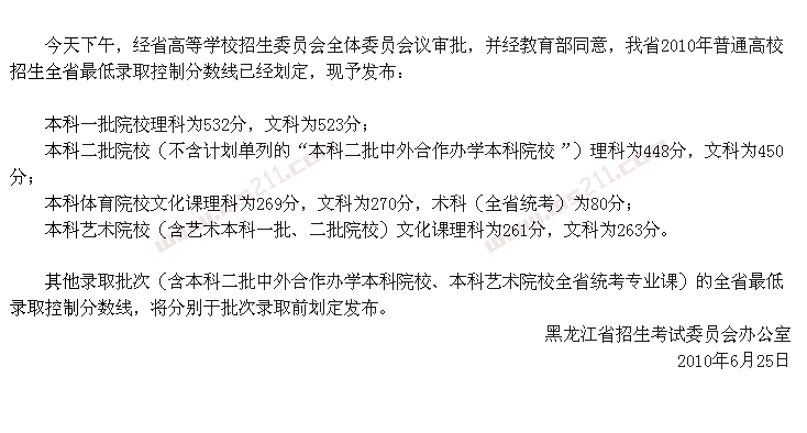 2010年黑龍江高考錄取分?jǐn)?shù)線(含美術(shù))
