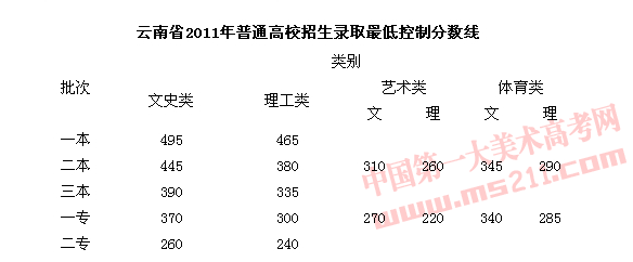 2011年云南省普通高等學(xué)校招生錄取控制分?jǐn)?shù)線