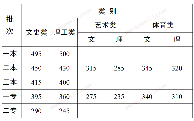 藝術(shù)類(lèi):二本文科330分理科300分;一專(zhuān)文科280分理科245分