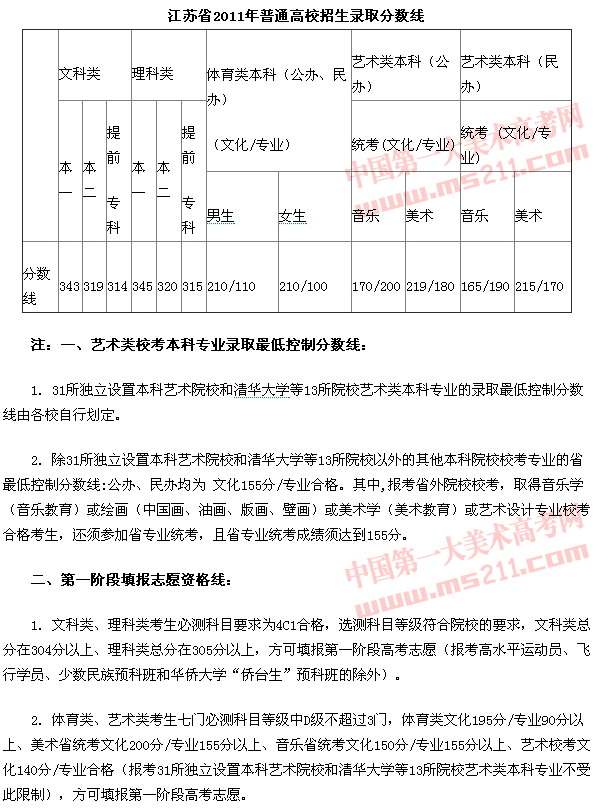 2010年江蘇高考錄取分數(shù)線(含美術)
