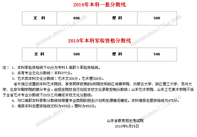2010年山東高考錄取分?jǐn)?shù)線(含美術(shù))