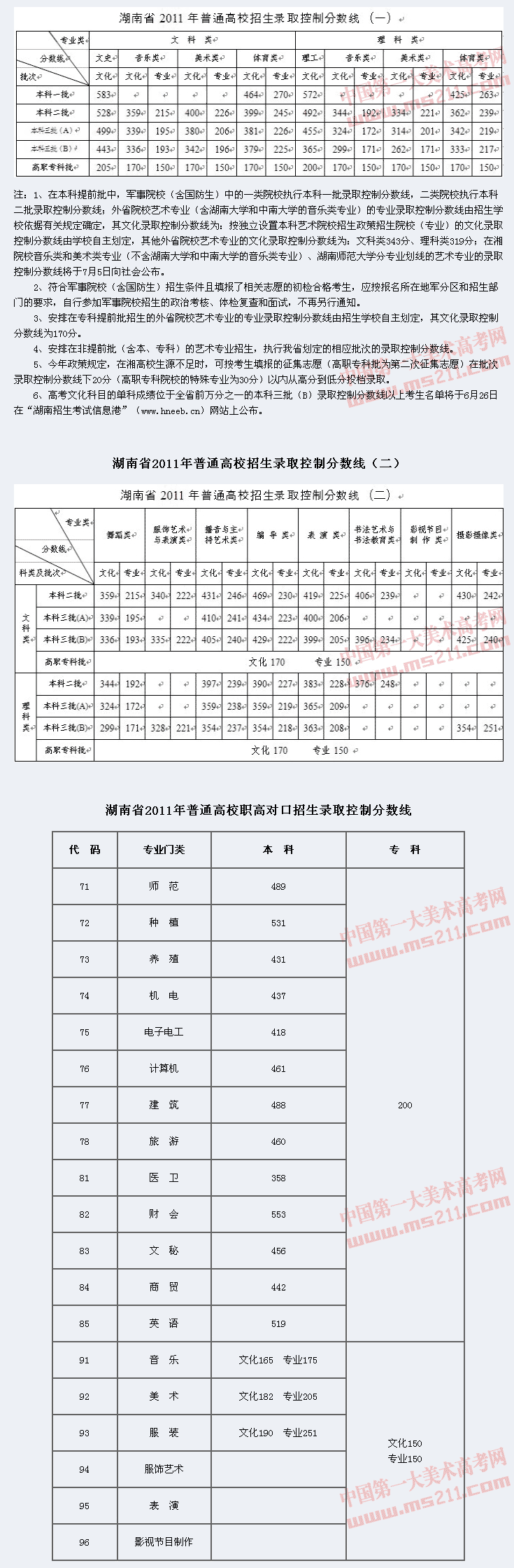 2011年湖南省普通高等學校招生錄取控制分數(shù)線
