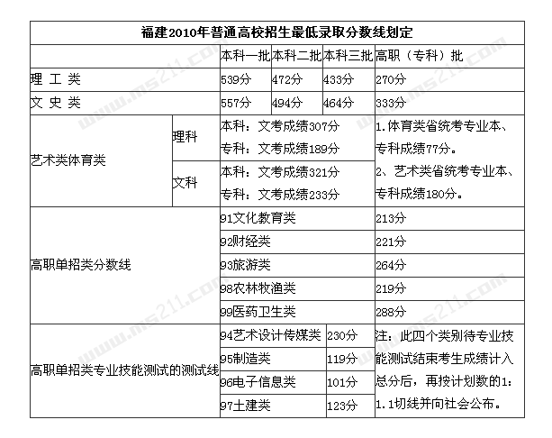 2010年福建高考錄取分?jǐn)?shù)線(含美術(shù))