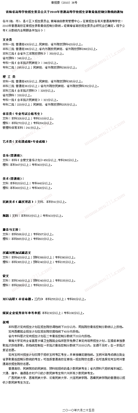 2010年青海高考錄取分?jǐn)?shù)線(含美術(shù))