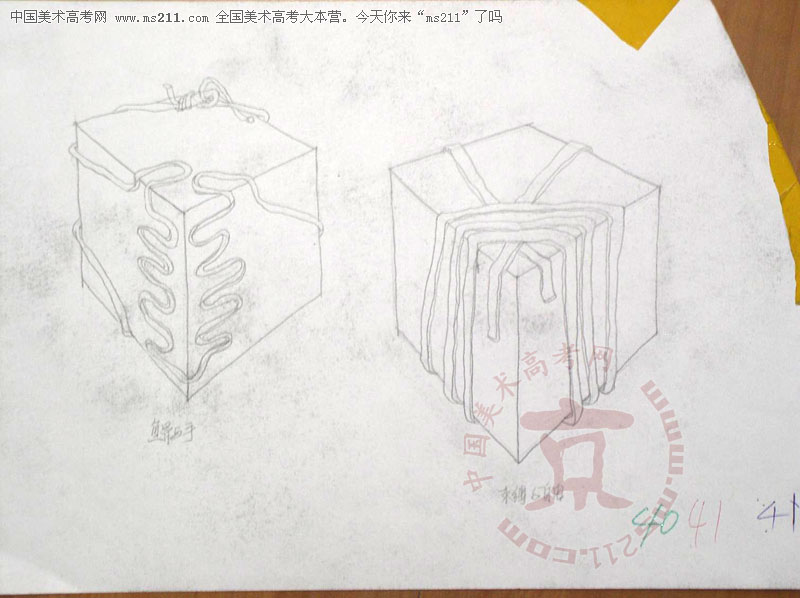 2003年北京服裝學(xué)院美術(shù)高考優(yōu)秀試卷(第1套創(chuàng)意速寫:繩子捆綁正方體)2007102934