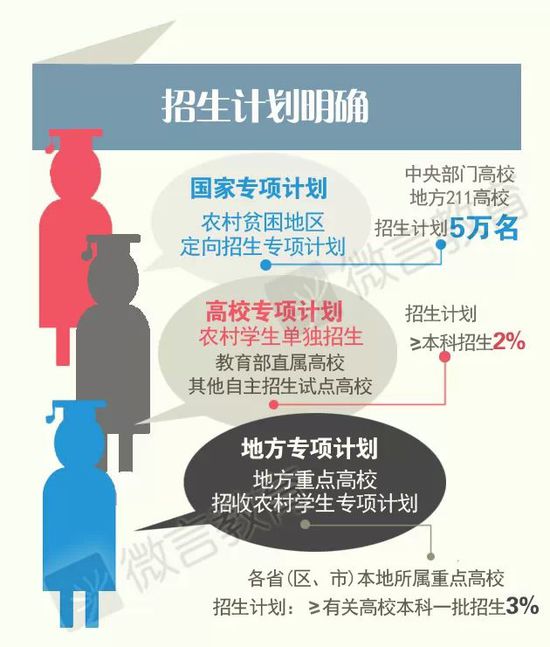 二是繼續(xù)實(shí)施農(nóng)村學(xué)生單獨(dú)招生(即高校專(zhuān)項(xiàng)計(jì)劃),由教育部直屬高校和其他自主招生試點(diǎn)高校承擔(dān),招生計(jì)劃不少于學(xué)校本科招生規(guī)模的2%,主要招收邊遠(yuǎn)、貧困、民族等地區(qū)縣及縣以下優(yōu)秀農(nóng)村學(xué)生,具體實(shí)施區(qū)域由有關(guān)?。▍^(qū)、市)確定。