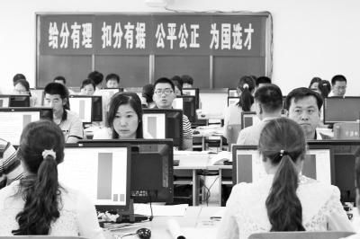 評(píng)卷室里,近百名評(píng)卷老師全神貫注地注視著我們的照片,不時(shí)敲擊鍵盤。