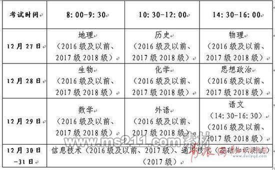 考試將于12月27日至31日進(jìn)行,屆時(shí)2016級(jí)及以前“普通高中學(xué)業(yè)水平考試”和2017級(jí)、2018級(jí)“普通高中學(xué)業(yè)水平合格考試”將同時(shí)進(jìn)行。其中12月27日考地理、歷史、物理,12月28日考生物、化學(xué)、思想政治,12月29日考數(shù)學(xué)、外語、語文,12月30日考信息技術(shù)、通用技術(shù)。2016級(jí)及以前“普通高中學(xué)業(yè)水平考試”開考除通用技術(shù)以外的10個(gè)科目。2017級(jí)、2018級(jí)“普通高中學(xué)業(yè)水平合格考試”開考11個(gè)科目,其中2017級(jí)考生可報(bào)考全部科目,2018級(jí)考生可報(bào)考除信息技術(shù)、通用技術(shù)以外的9個(gè)科目。