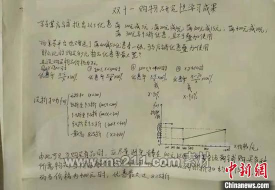 武鋼三中高一學生李昊洋利用函數(shù)模型為媽媽計算出一套購物省錢攻略。通過計算,李昊洋得出滿減計算公式、滿返計算公式。“‘滿X元返X元代金券’是最大的‘雙十一’最大的陷阱,會造成人們的沖動消費,經(jīng)過多種優(yōu)惠方案,直接打折的方式更直觀、劃算。”他說。