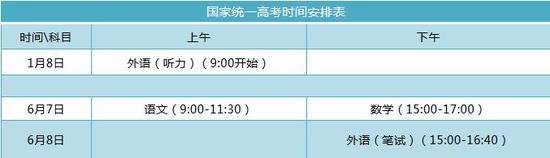統(tǒng)一高考科目使用全國統(tǒng)一命題試卷,考試時間安排在6月7日全天和8日下午,其中語文考試時間150分鐘,數(shù)學(xué)考試時間120分鐘,外語(筆試)考試時間100分鐘。外語(聽力)考試安排在1月8日上午,連續(xù)組織兩次,每次考試時長約20分鐘,考試成績?nèi)纱沃械母叻钟嬋敫呖纪庹Z科目成績。