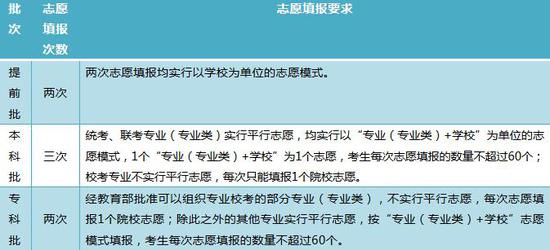 答:本科普通批。設(shè)置首次志愿、兩次征集志愿和高校服從調(diào)劑志愿,高校服從調(diào)劑志愿在第二次征集志愿時填報。首次志愿和兩次征集志愿均為專業(yè)類別內(nèi)平行志愿模式,首次志愿和第一次征集志愿可填報12個高校志愿,第二次征集志愿可填報10個高校志愿,每個高校志愿可填報4個專業(yè)及1個專業(yè)服從調(diào)劑志愿。