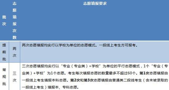 ?。?)本科批安排三次志愿填報。藝術(shù)類本科文化控制線上考生方可填報本科志愿。統(tǒng)考、聯(lián)考專業(yè)(專業(yè)類)實行平行志愿,均實行以“專業(yè)(專業(yè)類)+學(xué)校”為單位的志愿模式,考生每次志愿填報的數(shù)量不超過60個;??紝I(yè)不實行平行志愿,每次只能填報1個院校志愿。