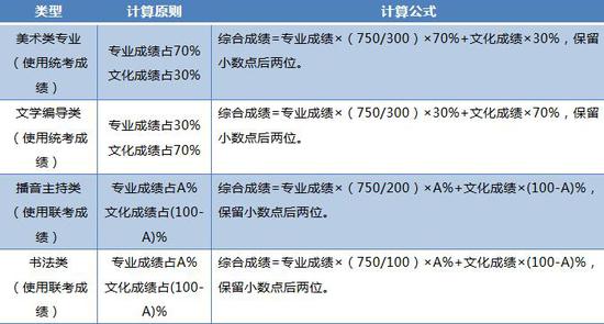 注:公式中的“750”是高考文化成績滿分分值,“300”是美術(shù)類和文學(xué)編導(dǎo)類統(tǒng)考成績滿分分值,“200”是播音主持類聯(lián)考成績滿分分值,“100”是書法類聯(lián)考成績滿分分值。A由聯(lián)考學(xué)校確定。