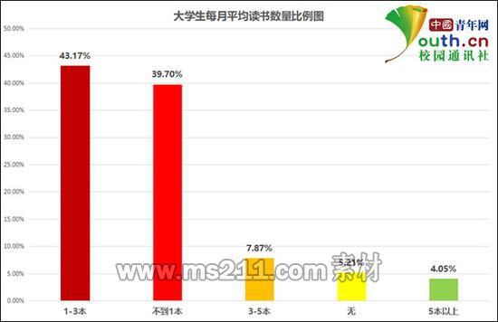 和高帥一樣讀書時間較少的大學生不在少數(shù),根據(jù)中國青年網(wǎng)記者調(diào)查顯示,46.3%的受訪學生平均每天讀書時間不足30分鐘,每天花費30分鐘到1個小時、1個小時以上時間讀書的學生分別占33.91%、19.79%。在讀書數(shù)量上,44.91%的受訪學生平均每月讀書不到一本,另有43.17%和11.92%的學生分別平均每月讀書1-3本和3本以上。