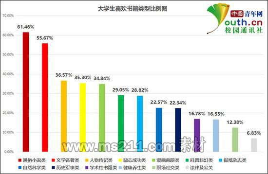 在本次調(diào)查中,82.64%的受訪學生表示自己喜歡讀書。那么,大學生對什么類型的書最感興趣呢?調(diào)查顯示,通俗小說類最受歡迎,占受訪學生的61.46%,其次選擇文學名著類和人物傳記類,分別為55.67%和36.57%。