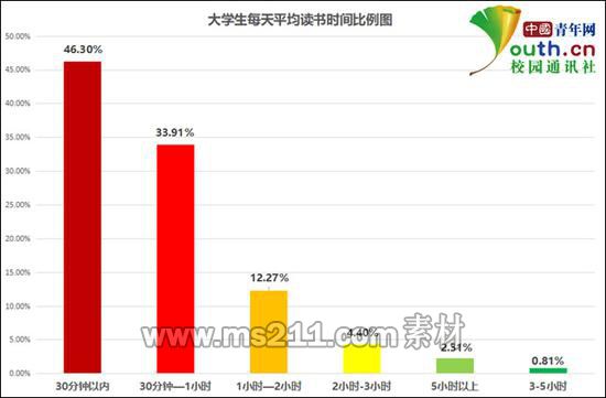 大學生每天平均讀書時間比例。中國青年網(wǎng)記者 李華錫 制圖近五成每天讀書不足半小時,超四成每月讀書不足一本