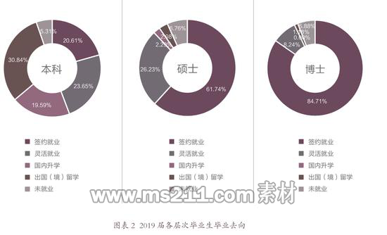 其中,2019屆本科畢業(yè)生1281人,直接就業(yè)率為44.27%;已升學(xué)251人,已留學(xué)395人,繼續(xù)深造率為50.43。%;碩士畢業(yè)生873人,直接就業(yè)率為87.97%;已升學(xué)20人,已留學(xué)26人;碩士生去向落實率93.24%。
