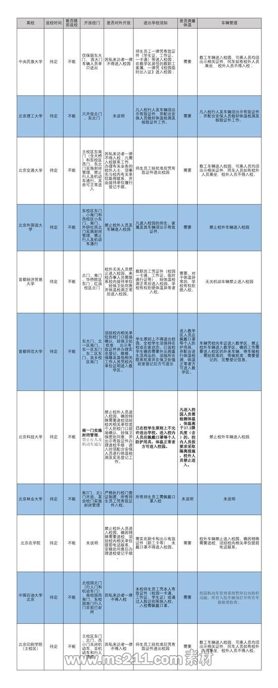 在車輛管理上,多數(shù)高校明確要求,無關(guān)機動車輛不得進入校園,教工車輛進入校園前需出示有效證件。中央民族大學(xué)和北京交通大學(xué)(分?jǐn)?shù)線,專業(yè)設(shè)置)均明確表示,教工車輛中如有校外人員乘坐, 校外人員不得入校。