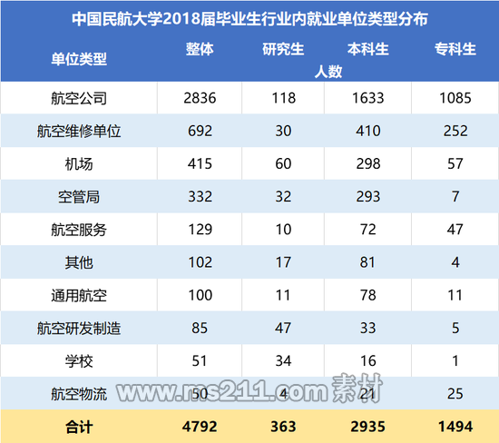 2018畢業(yè)生中有85%的學(xué)生從事與民航事業(yè)相關(guān)工作。就業(yè)人數(shù)前3位的單位類型分別是航空公司、維修單位和機(jī)場。