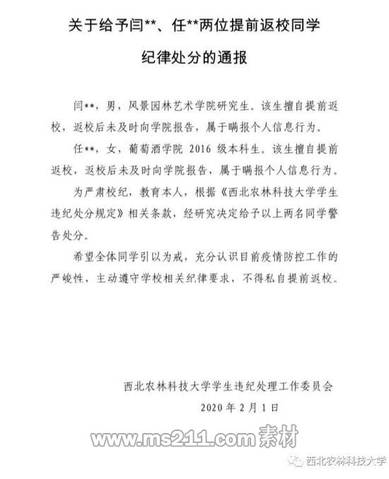 根據(jù)通報(bào)內(nèi)容,該校風(fēng)景園林藝術(shù)學(xué)院研究生閆某某、葡萄酒學(xué)院2016級(jí)本科生任某某,擅自提前返校,且未及時(shí)向?qū)W院報(bào)告,屬于瞞報(bào)個(gè)人信息行為。