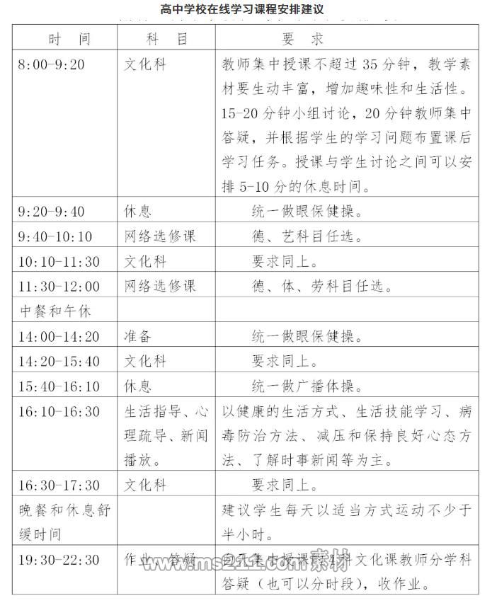 2。優(yōu)化排課方式。各高中學校要結(jié)合在線教學特點,科學安排在線教學課程表。在線教學每節(jié)課不超過40分鐘,文化課根據(jù)教學實際可以兩節(jié)課聯(lián)排,一節(jié)課集中授課,一節(jié)課討論交流和答疑;網(wǎng)絡(luò)選修課控制在10-30分鐘內(nèi)。文化課與網(wǎng)絡(luò)選修課交錯安排,以增加課程豐富性。(課程安排建議見文末)